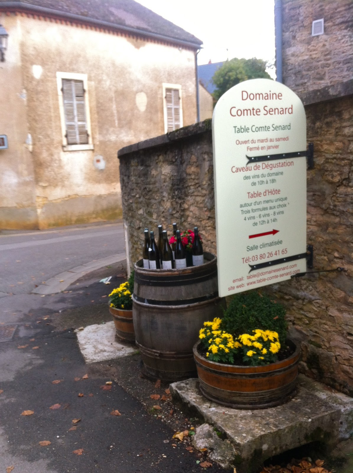 My friend / invaluable guide J and I had a question mark on our tasting schedule after leaving Domaine Alain Burguet in Gevrey. We'd been thinking to go taste with Sarnin and / or Berrux of the excellent natural Burgundy négociant operation Sarnin-Berrux. But the way things shook out it seemed simpler and more timely to pass by the tasting rooms of Domaine Comte Senard in Aloxe-Corton, not because the acclaimed, somewhat pricey wines were to be any great discovery (for J, at least), but because the night before we'd gotten pleasantly soused in Beaune with a sharp young sommelier called E, who helps run Domaine Comte Senard's restaurant and tasting rooms.