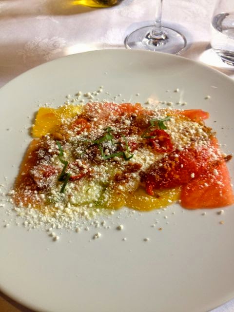 The local goat cheese on the tomato carpaccio was in ice form. The day was almost hot enough to redeem the otherwise pointless flourish.